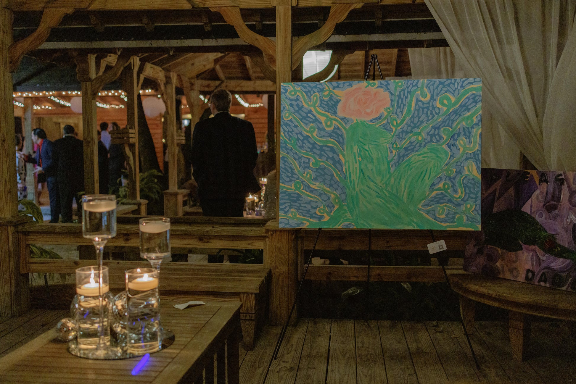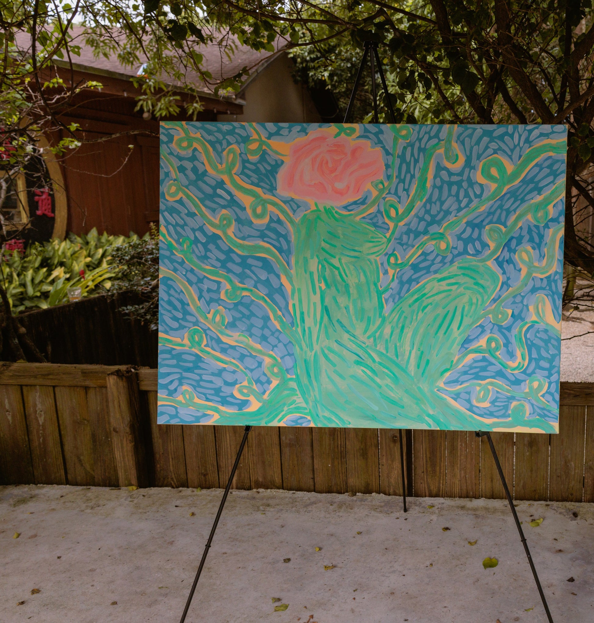 Immerse in the 'Essence,' an abstract celebration where a solitary rose emerges from aqua and teal currents, reminiscent of the fluidity of water and the grace of nature's blooms. This acrylic painting blends vivid colors with organic forms to create a serene visual experience, perfect for adding a tranquil yet spirited touch to any living space.