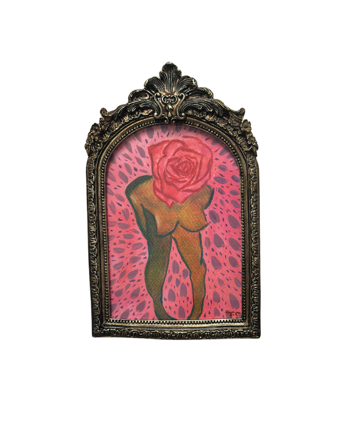 This painting represents a rose puckering up for undeniable love and ready for connection. It holds the energy of anticipation, softness, and bold vulnerability. Like a bloom leaning in, it symbolizes the moment just before love meets love. The surrounding lines and movement reflect her energy open, magnetic, and pulsing with the thrill of possibility.