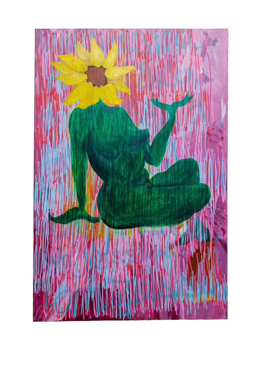 A vibrant sunflower-headed figure sits poised in effortless grace, the delicate curve of her body reflecting both power and tranquility. Her presence fills the canvas with a quiet, confident energy, while the bright colors and expressive brushstrokes give her an undeniable strength. She is a living embodiment of Maya Angelou’s words: