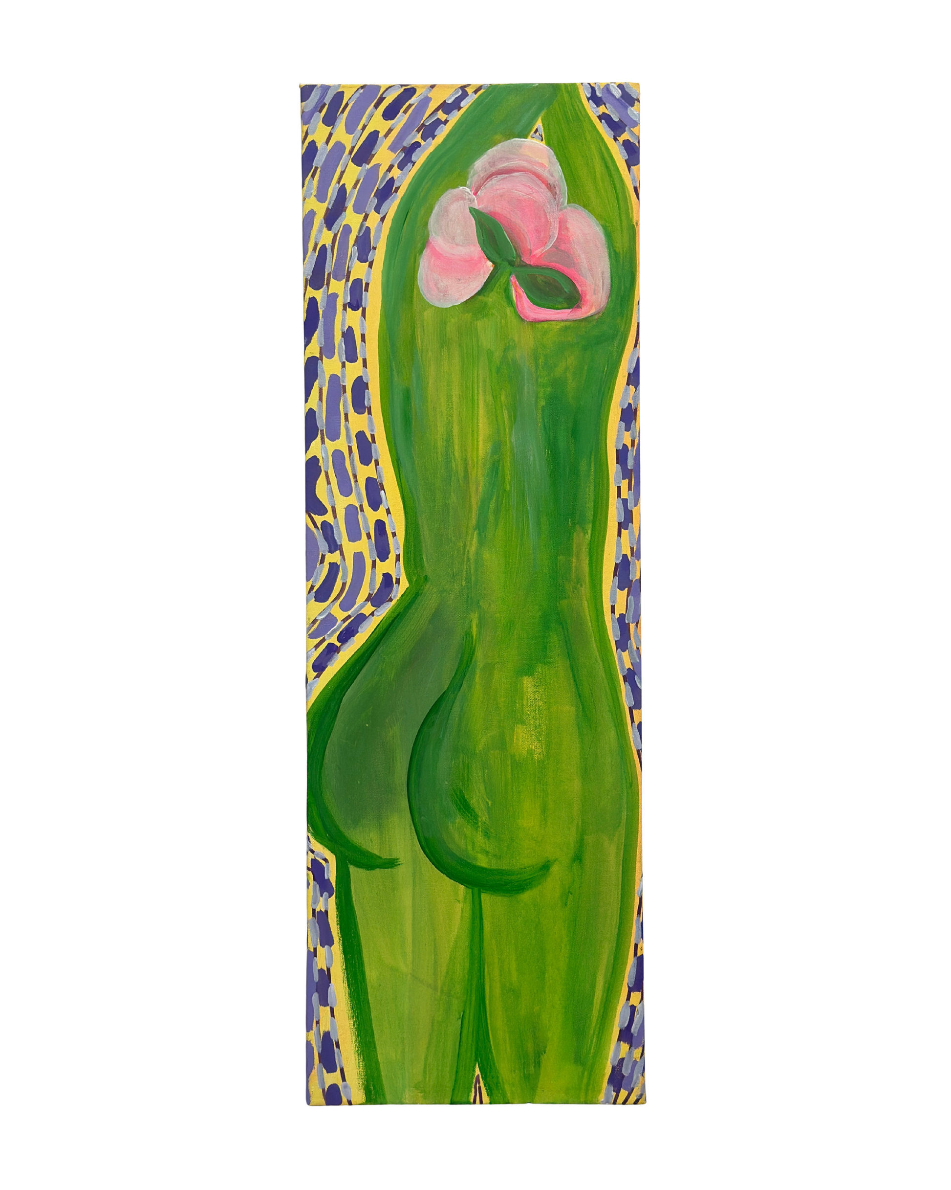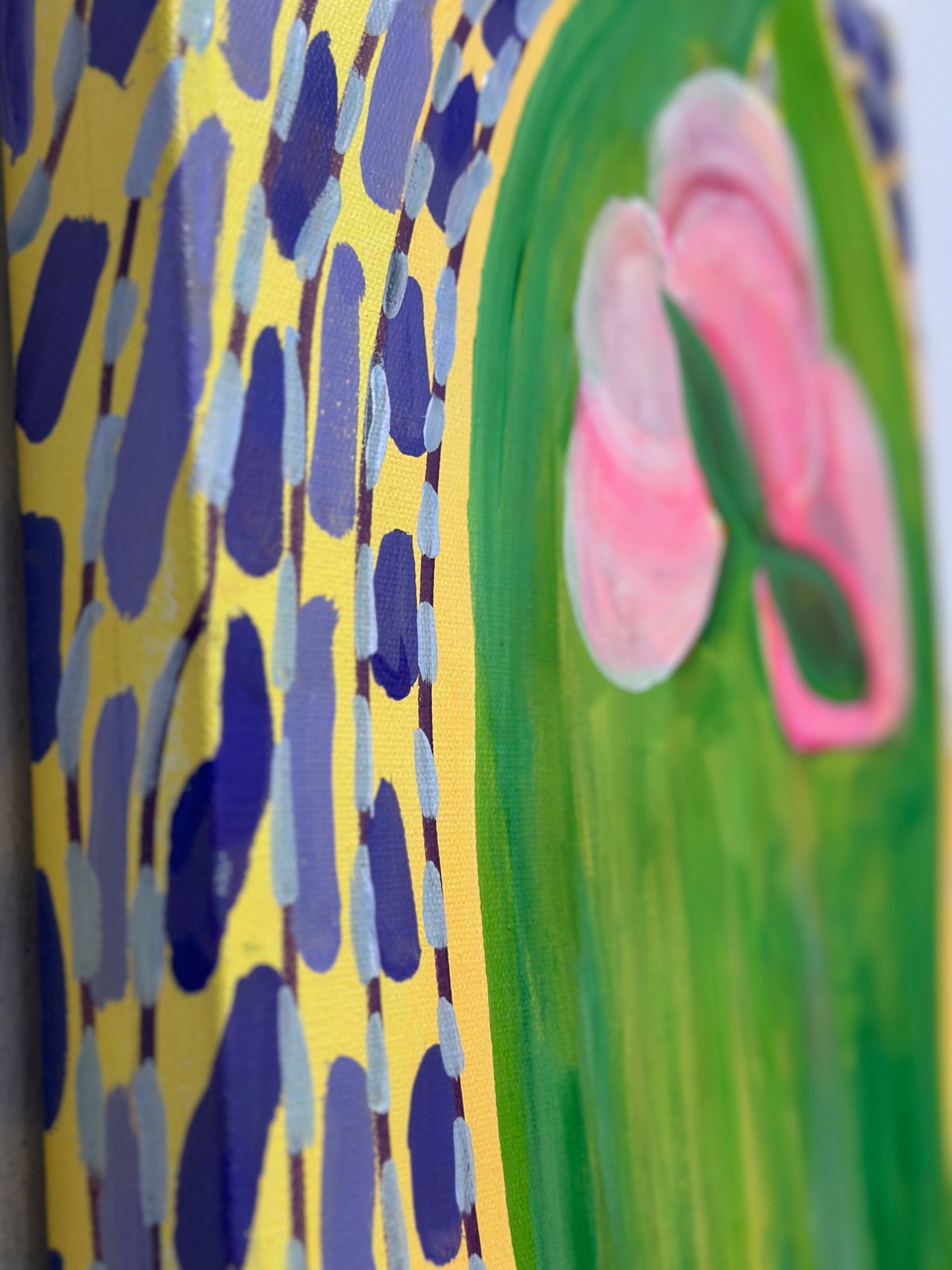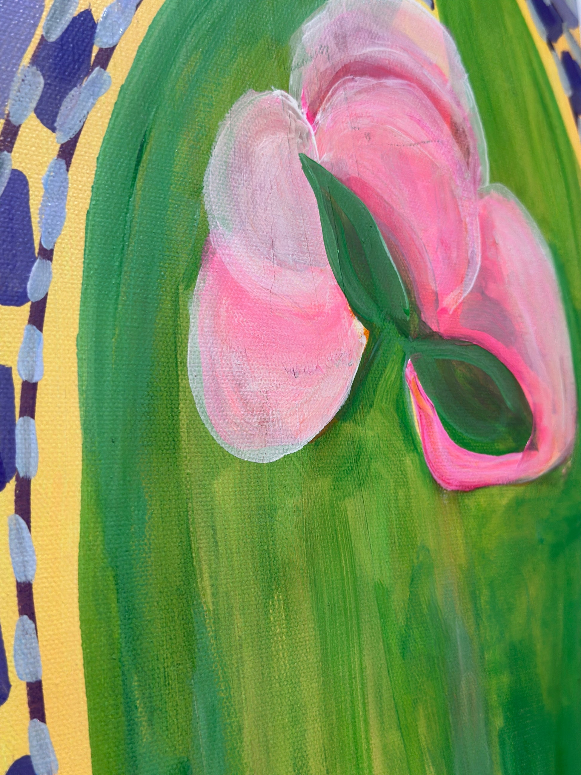 This painting tells the story of reaching of trusting that the next chapter is already unfolding. Her body takes center stage, stretched out in motion, focused and grounded. Yet she remains soft, radiant in her divine feminine energy. The delicate pink flower symbolizes grace through transition how beauty can still exist when you're pushing forward.