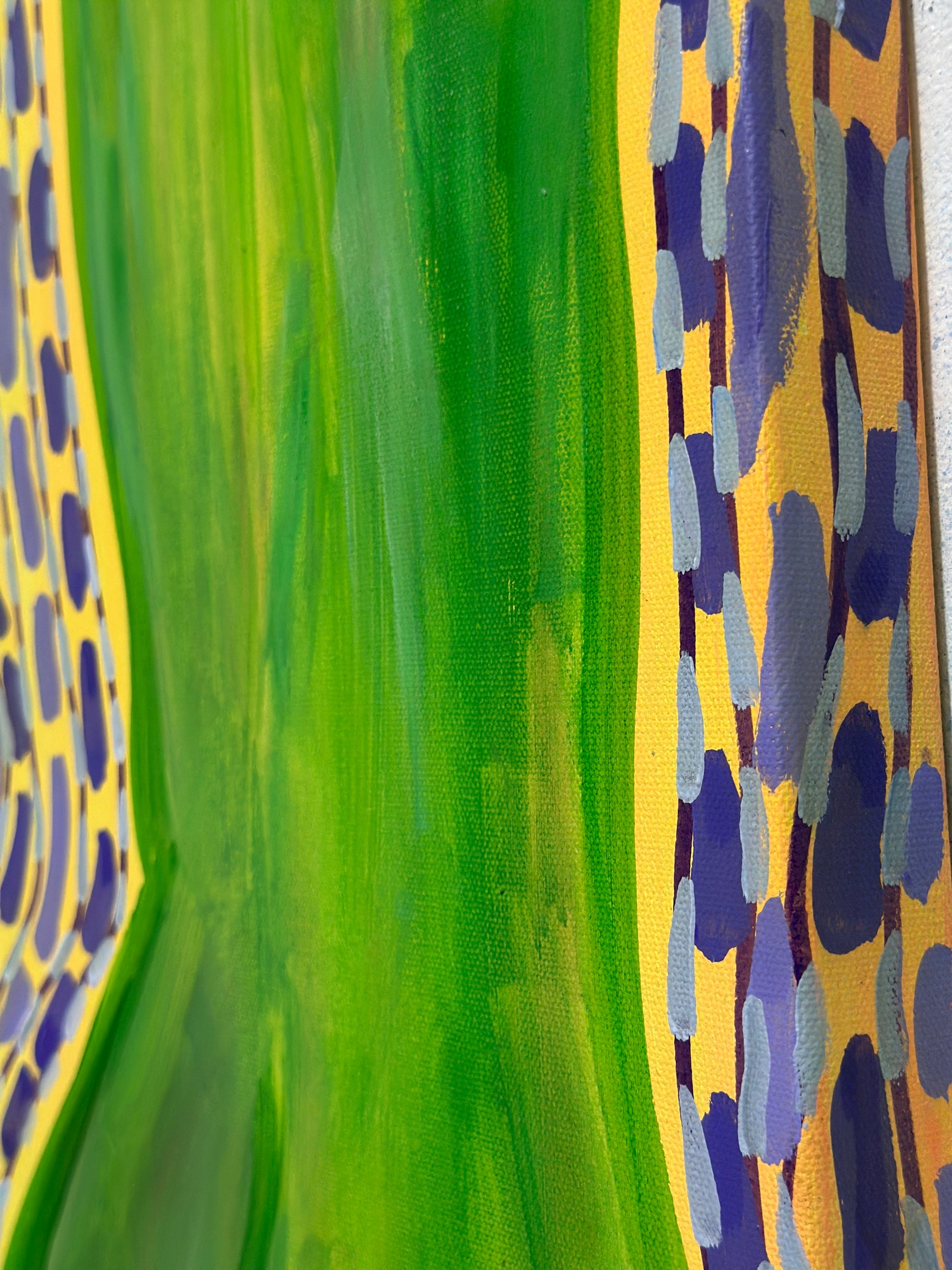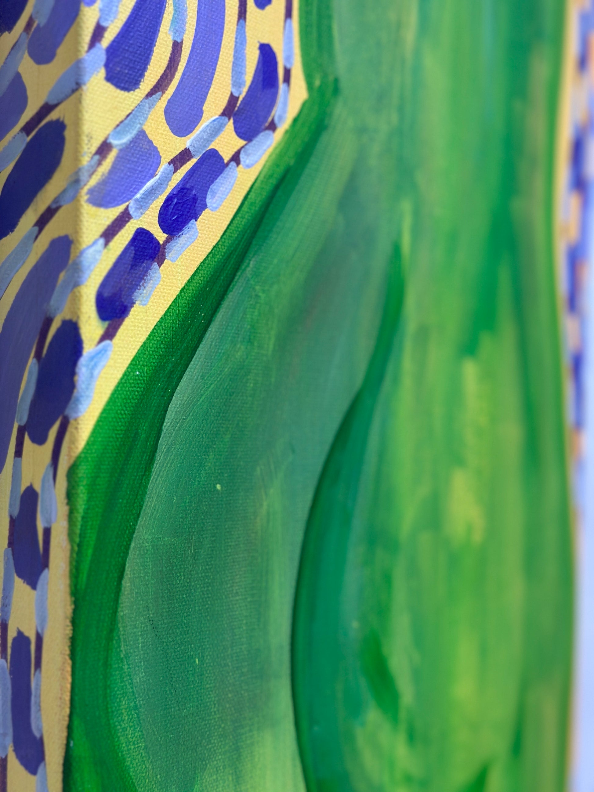 The flowing patterns across her body are her boundless energy, moving with her, not against her. I painted this during a time when I was chasing new goals, unsure but hopeful. She reminds me and hopefully you that even in the unknown, there is power in staying open, staying soft, and stretching forward anyway.