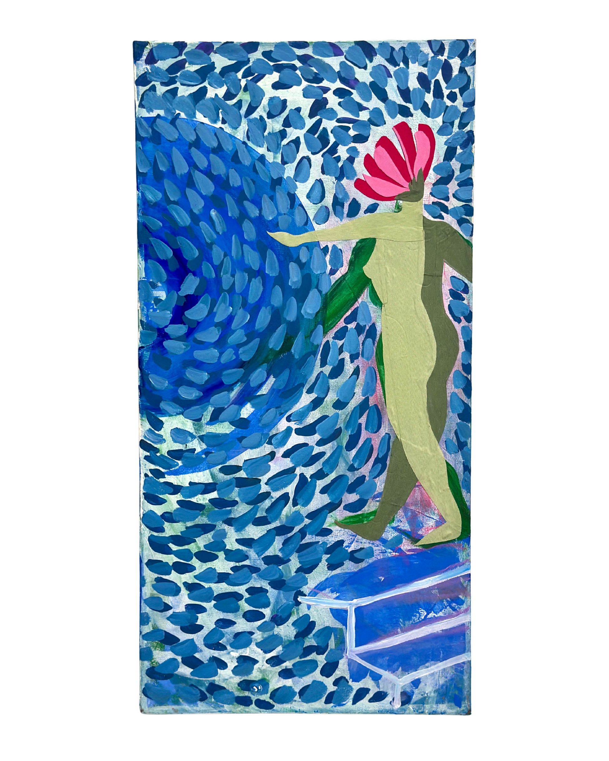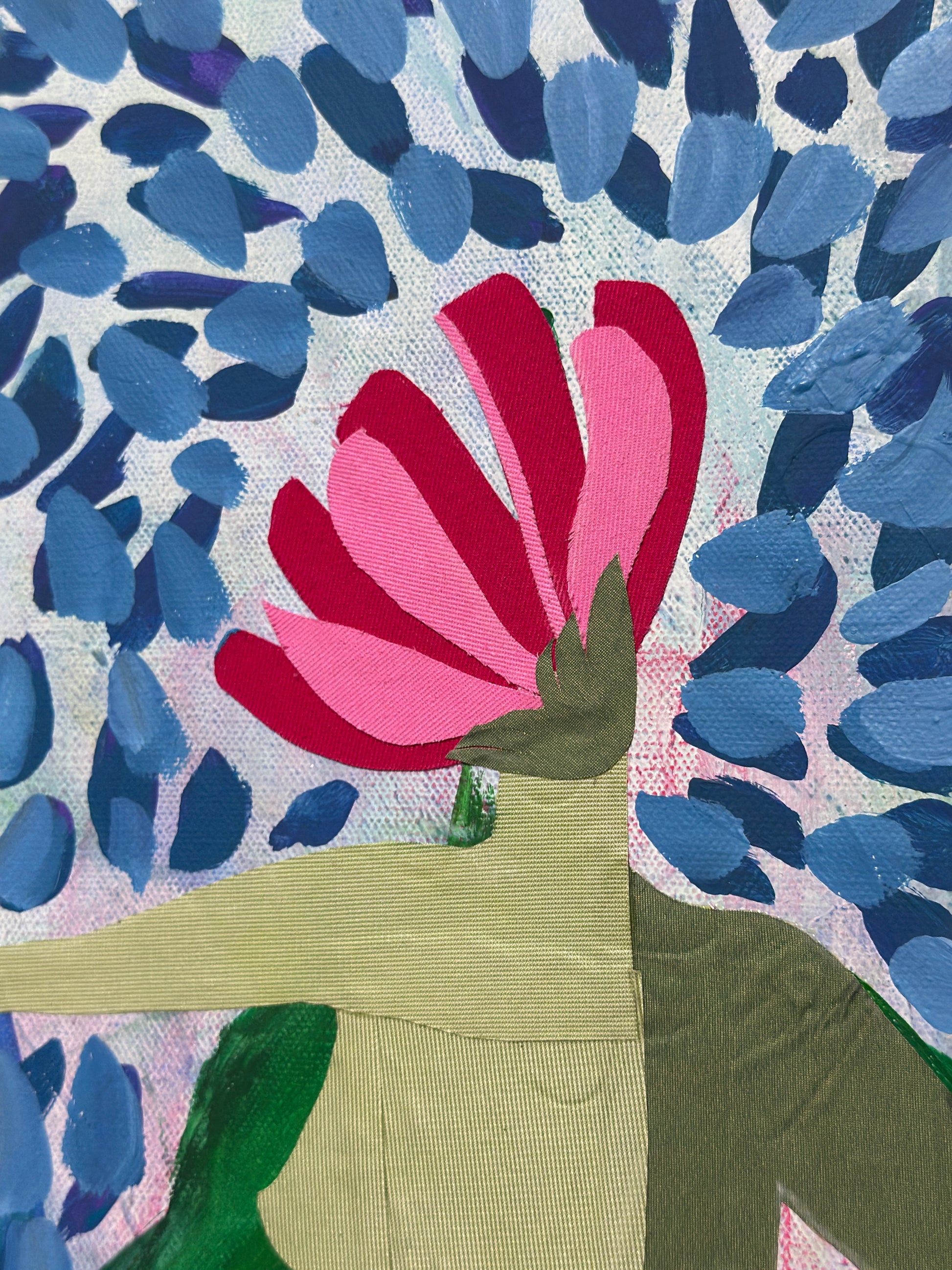 This piece is a reflection of stepping boldly into the unknown. The flower-headed messenger is made using an iron-on fabric technique I had never tried before intentionally mirroring the theme of the work: taking risks, trying something new, and trusting the journey.