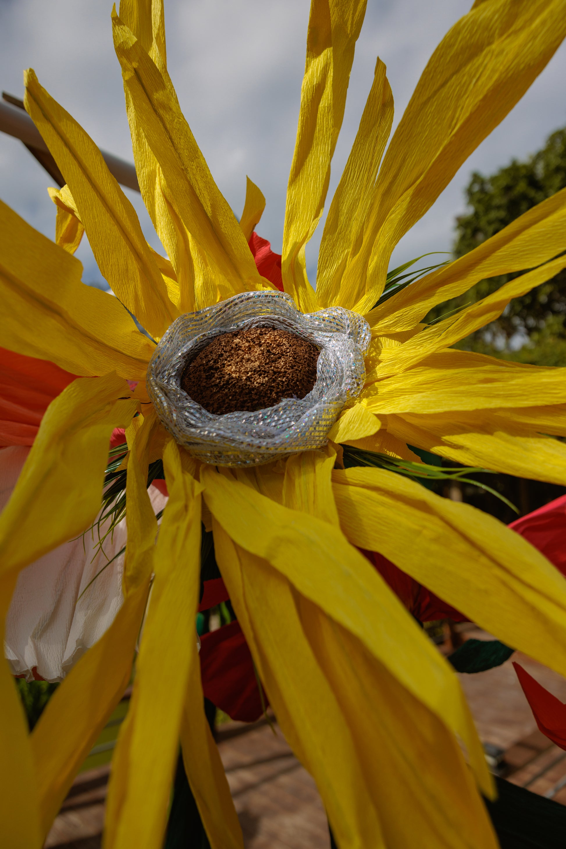 Sunbeam Spike Blossom, a radiant creation where art meets nature. Its petals burst in a spectrum of fiery reds and soft pinks, expertly crafted from crepe paper to capture the essence of a sunlit flower. The green PVC pipe stem anchors the bloom in strength, allowing it to stand proudly as a centerpiece. Sparkling dewdrop accents enhance the petal's textures, offering a lifelike appearance. This everlasting floral art piece promises to bring a warm, sun-kissed vibe to any decor.