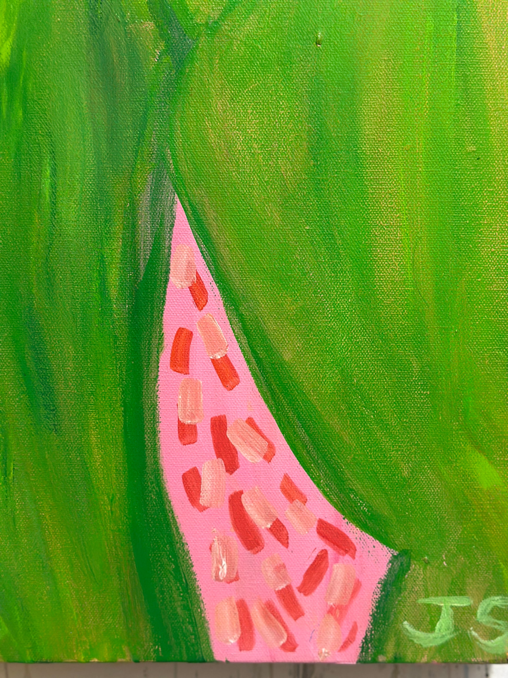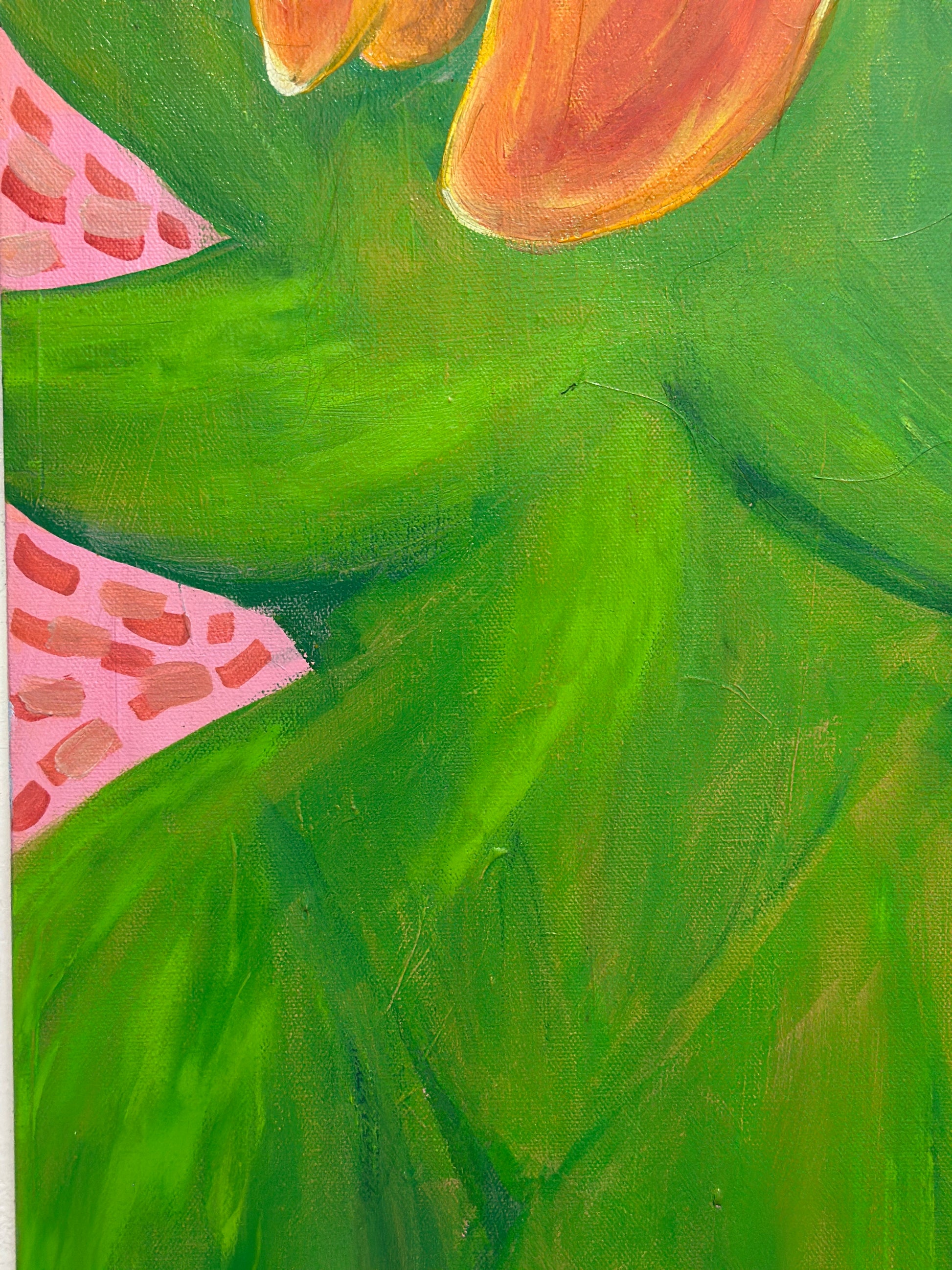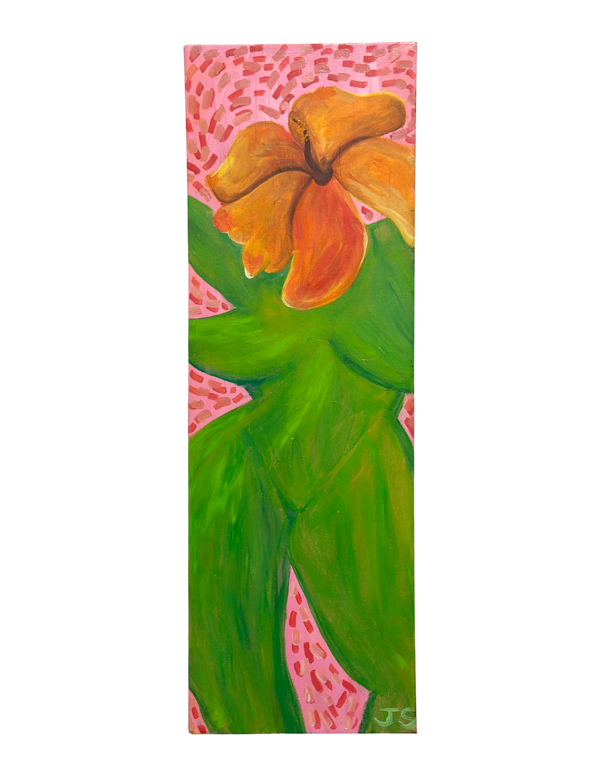 This piece is deeply personal. I painted it during a time when I was learning to stop shrinking myself physically, emotionally, creatively. The orange hibiscus, bold and bright, became a mirror for that growth. Her body expands beyond the canvas, refusing to be contained. The dashes that swirl around her are her rhythm, her energy, her joy. She’s not holding back she’s dancing, fully in the moment.